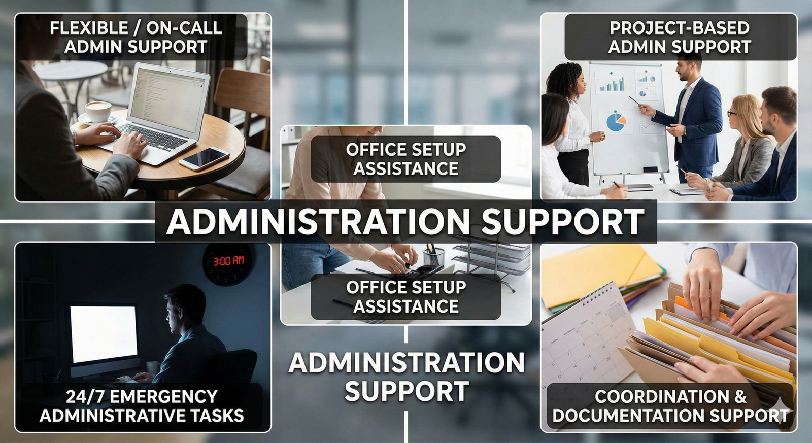 • Flexible / On-call admin support • Project-based admin support • Office setup assistance • 24/7 emergency administrative tasks • Coordination & documentation support